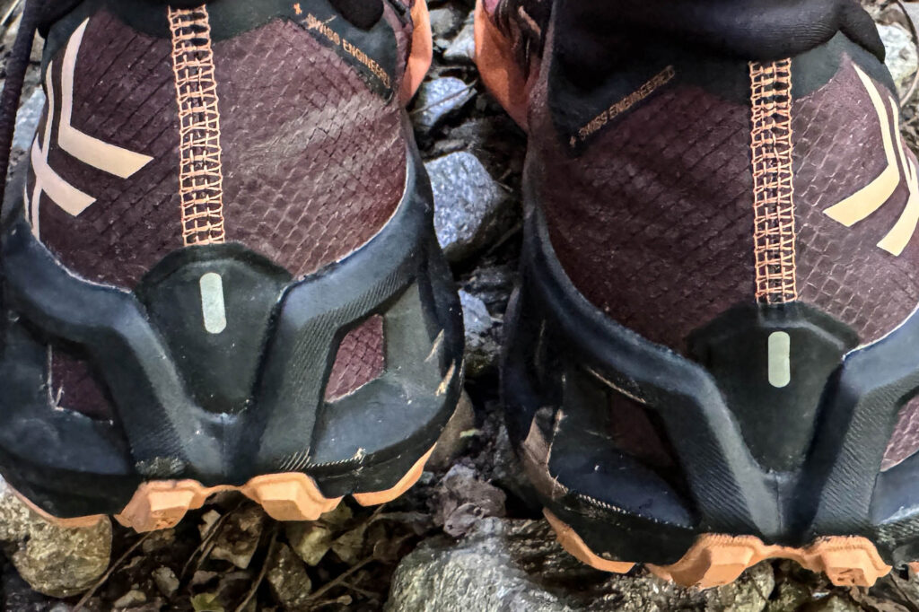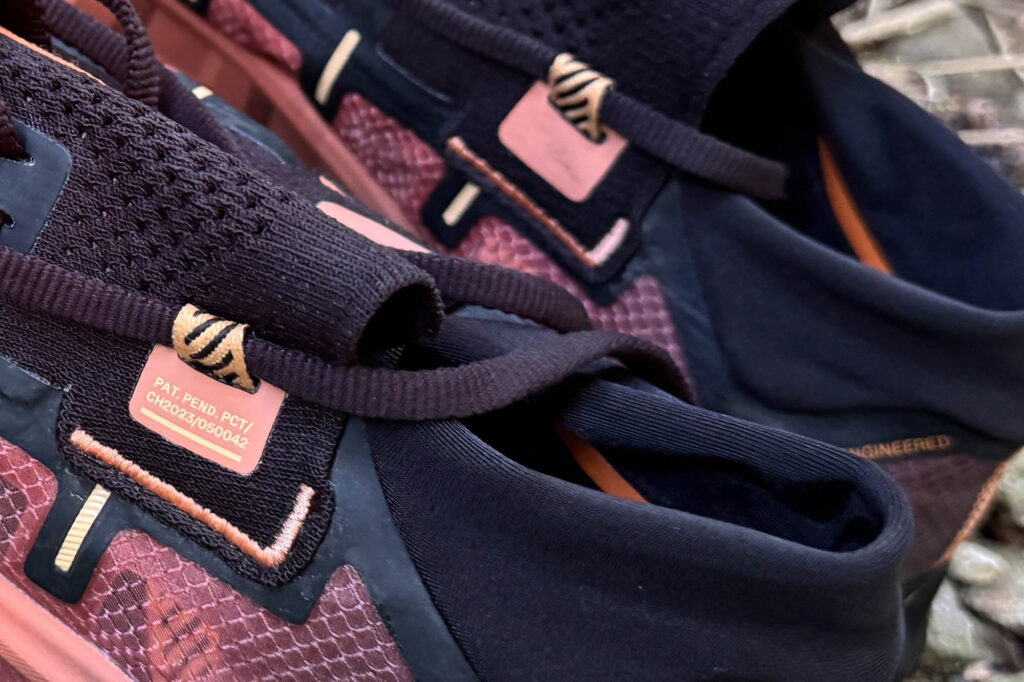 I lacci attraversano occhielli rinforzati, ma scorrono con difficoltà, rendendo complicata la regolazione della calzata. Dopo circa due ore di utilizzo, si avverte una fastidiosa pressione sul collo del piede, dovuta alla scarsa imbottitura della linguetta. La zona tallonare è ben strutturata e avvolge il piede in modo sicuro, ma nel complesso l’upper risulta meno confortevole e funzionale rispetto a quanto ci si aspetterebbe da una scarpa di fascia premium. Un dettaglio che incide negativamente sull’esperienza d’uso, soprattutto nelle uscite più lunghe.