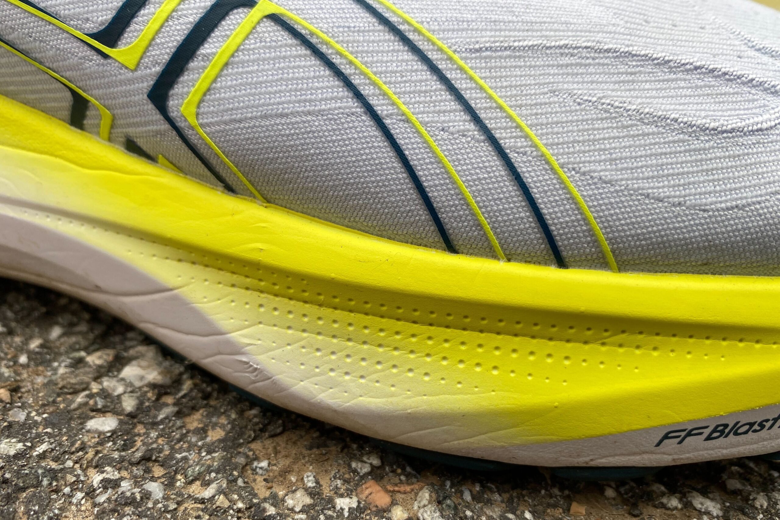 L’intersuola presenta un’altezza di 36 mm nel tallone e 28 mm in avampiede, con un drop di 8 mm. È proprio in questo ambito che la GT-2000 14 compie un deciso passo avanti grazie all’inserimento della schiuma FF Blast Max. Si tratta di una delle mescole più reattive della casa nipponica, capace di offrire un eccellente ritorno di energia, abbinata alla tecnologia PureGEL nel tallone, studiata per migliorare la fase di ammortizzazione.