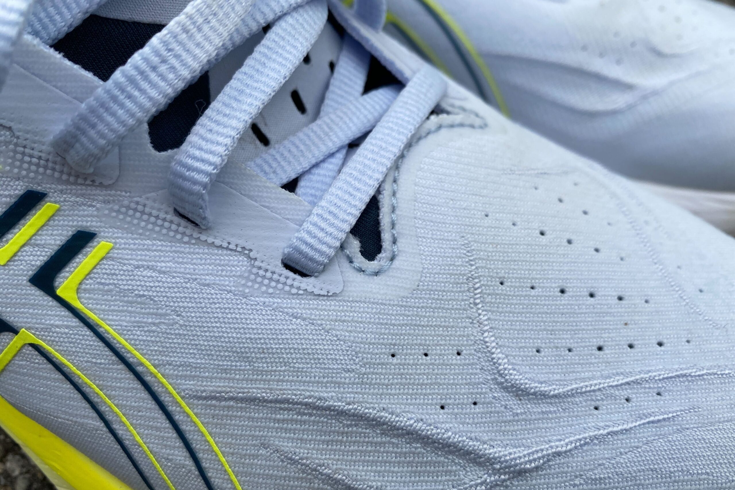 La tomaia è composta da un tessuto traspirante leggero, con inserti più rigidi nella sezione di punta. I forellini per la traspirazione e i ricami puramente estetici offrono una sensazione di tomaia molto “filante” nonostante l’avampiede sia comunque ampio e comodo per le dita del piede.