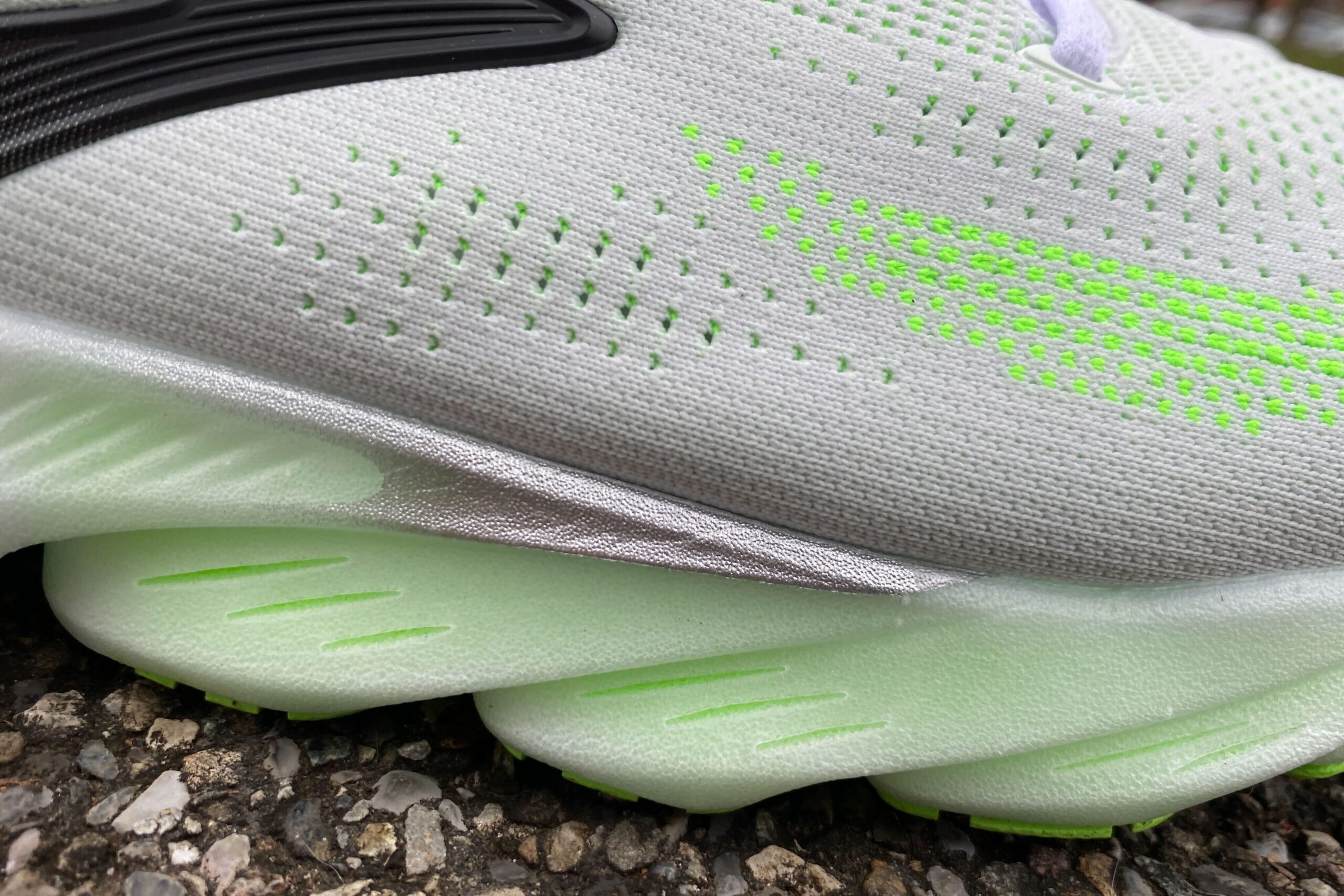 Il punto centrale della scarpa è la sua flessibilità, assicurata dalla FlexZone, una serie di profondi intagli nella zona mediale dell’intersuola che favoriscono una rullata naturale. La schiuma è la DNA Tuned, già utilizzata sulla Glycerin Max, iniettata con azoto e caratterizzata da densità variabile: più compatta sul tallone per assorbire meglio gli impatti, più soffice nell’avampiede per garantire una transizione fluida.