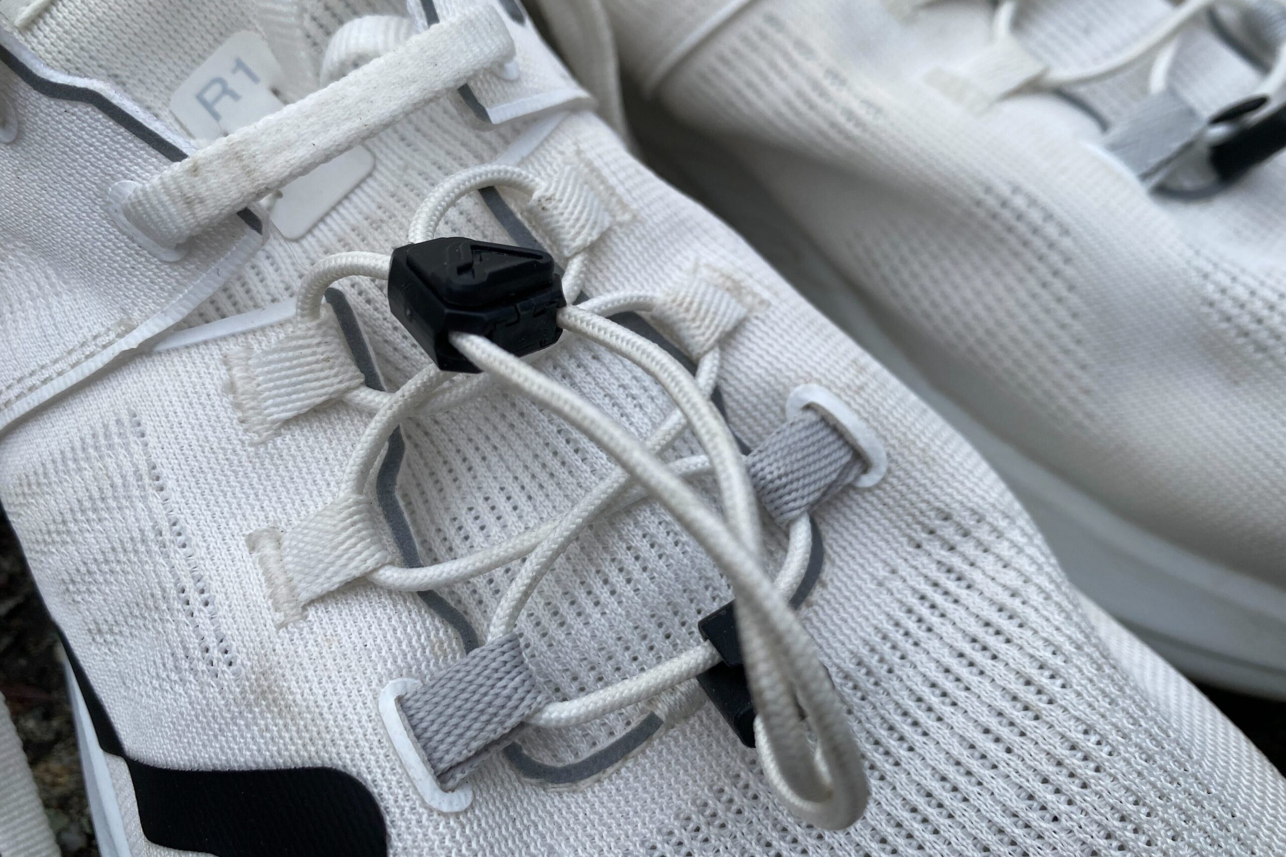 Uno degli elementi più caratteristici delle Mount to Coast R1 è il doppio sistema di allacciatura TunedFit Dual Lacing: nella parte superiore troviamo lacci piatti tradizionali, mentre sull’avampiede è presente un cordino regolabile che si blocca una volta trovata la tensione desiderata. L’adattamento richiede qualche uscita, soprattutto per chi ha un piede più stretto e cerca un fissaggio preciso nella zona anteriore. Per runner con avampiede normale o che non amano allacciature molto serrate, l’esperienza sarà invece intuitiva e immediata.