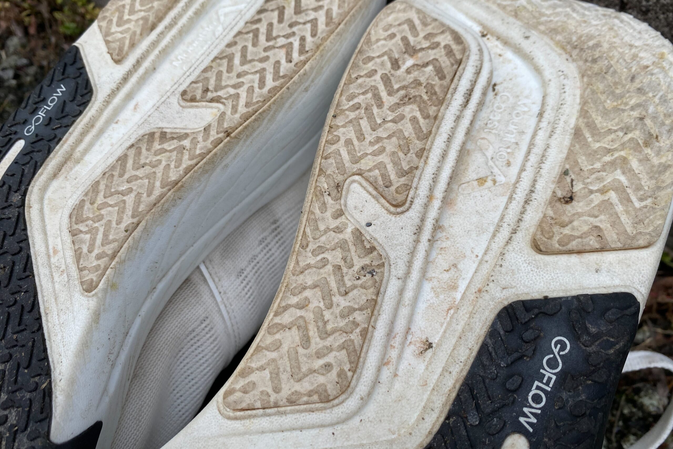 Dopo circa 150 km il consumo del battistrada risulta inferiore rispetto alla media di altre calzature della stessa categoria. La suola integra inoltre la particolare geometria GoFlow, progettata per favorire una transizione più fluida dal tallone alla punta, migliorando la continuità della falcata durante i lunghi chilometraggi.