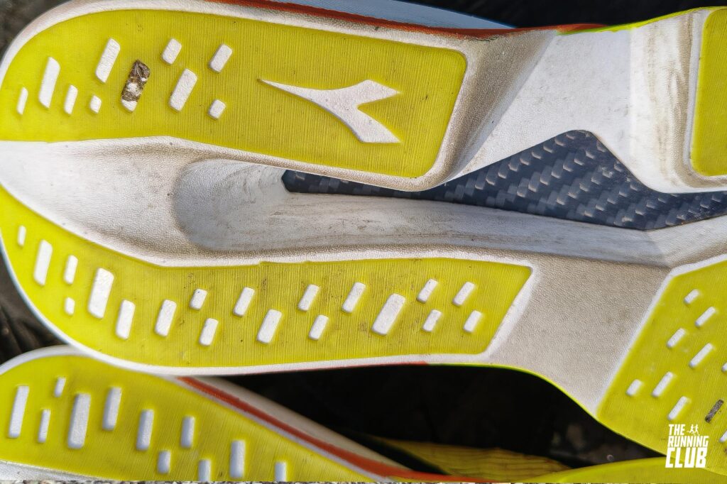 Il battistrada si presenta con una copertura ampia e ben distribuita. L’avampiede è completamente protetto, mentre nella zona posteriore la gomma copre gran parte della superficie, lasciando scoperta solo la parte interna dove rimane visibile la piastra in carbonio.
