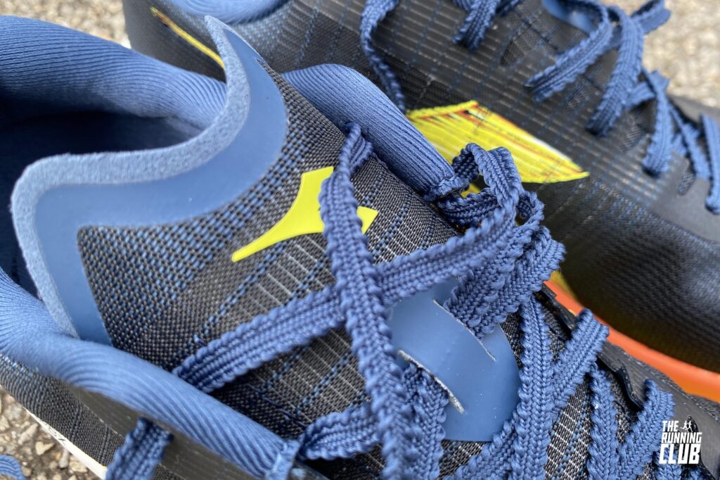 La linguetta, ispirata ai modelli da pista, è leggera ma dotata di una copertura interna in materiale sintetico che contribuisce a migliorare la calzata. Cambia anche il sistema di allacciatura, con occhielli singoli che permettono una distribuzione più uniforme della pressione sul dorso del piede.