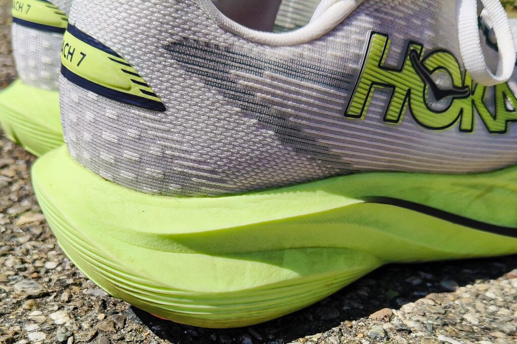 Tra gli aspetti più riusciti va segnalato il battistrada. Dopo l’EVA gommato utilizzato nelle versioni precedenti al modello 6, eccellente per grip ma poco duraturo, Hoka ha confermato anche su Mach 7 una soluzione più tradizionale con inserti in gomma dura, già vista su Mach 6. Il grip si conferma molto buono e la durata nel tempo elevata, merito sia dello spessore della gomma sia della sua disposizione.